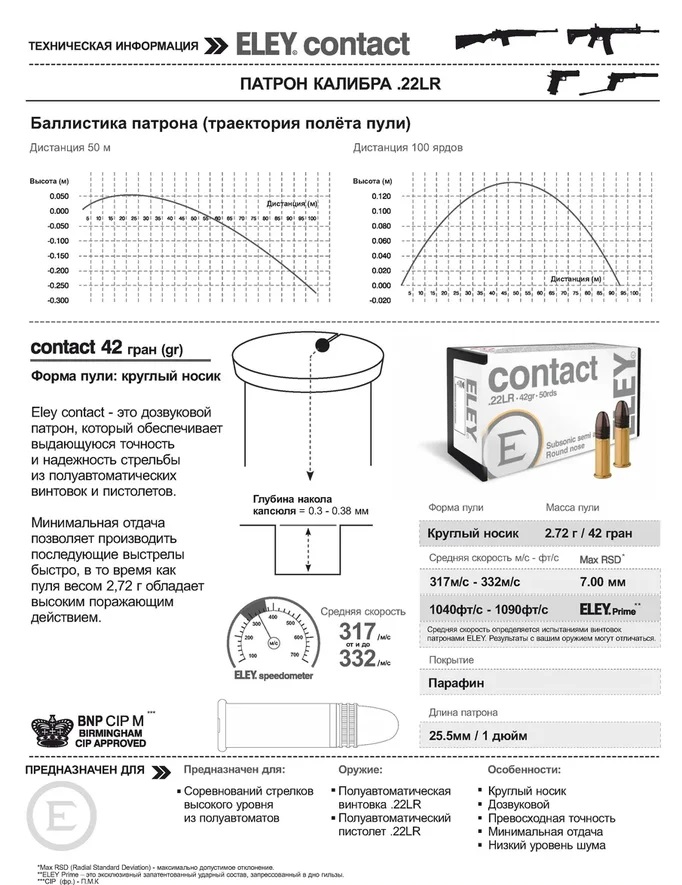 И ELEY Force, и ELEY Contact сконструированы с использованием более тяжёлых пуль весом 42 гран для высокой энергии и покрыты специальным парафиновым воском, чтобы свести к минимуму образование нагара в механизмах и магазинах.