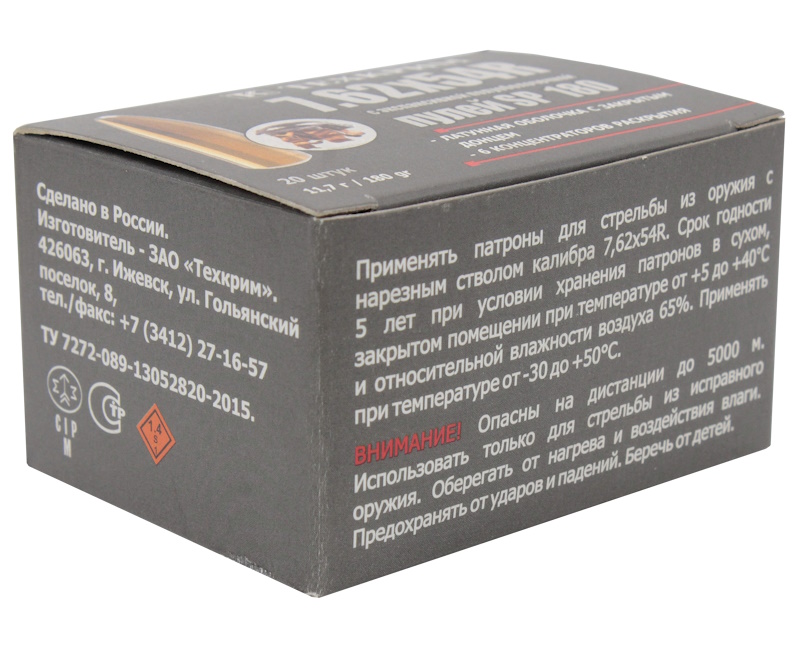 Патрон 7,62х54 SP 180 от «Техкрим» отличается тщательно выверенными техническими характеристиками. Масса пули составляет 11,7 грамм (180гран), что обеспечивает оптимальный баланс между настильностью траектории и передачей энергии. Стальная фосфатированная гильза гарантирует надежную экстракцию и стабильность при выстреле. Начальная скорость пули составляет 740 м/с, а кучность на дистанции 100 метров – всего 30 мм, что свидетельствует о высокой точности и стабильности данного патрона.